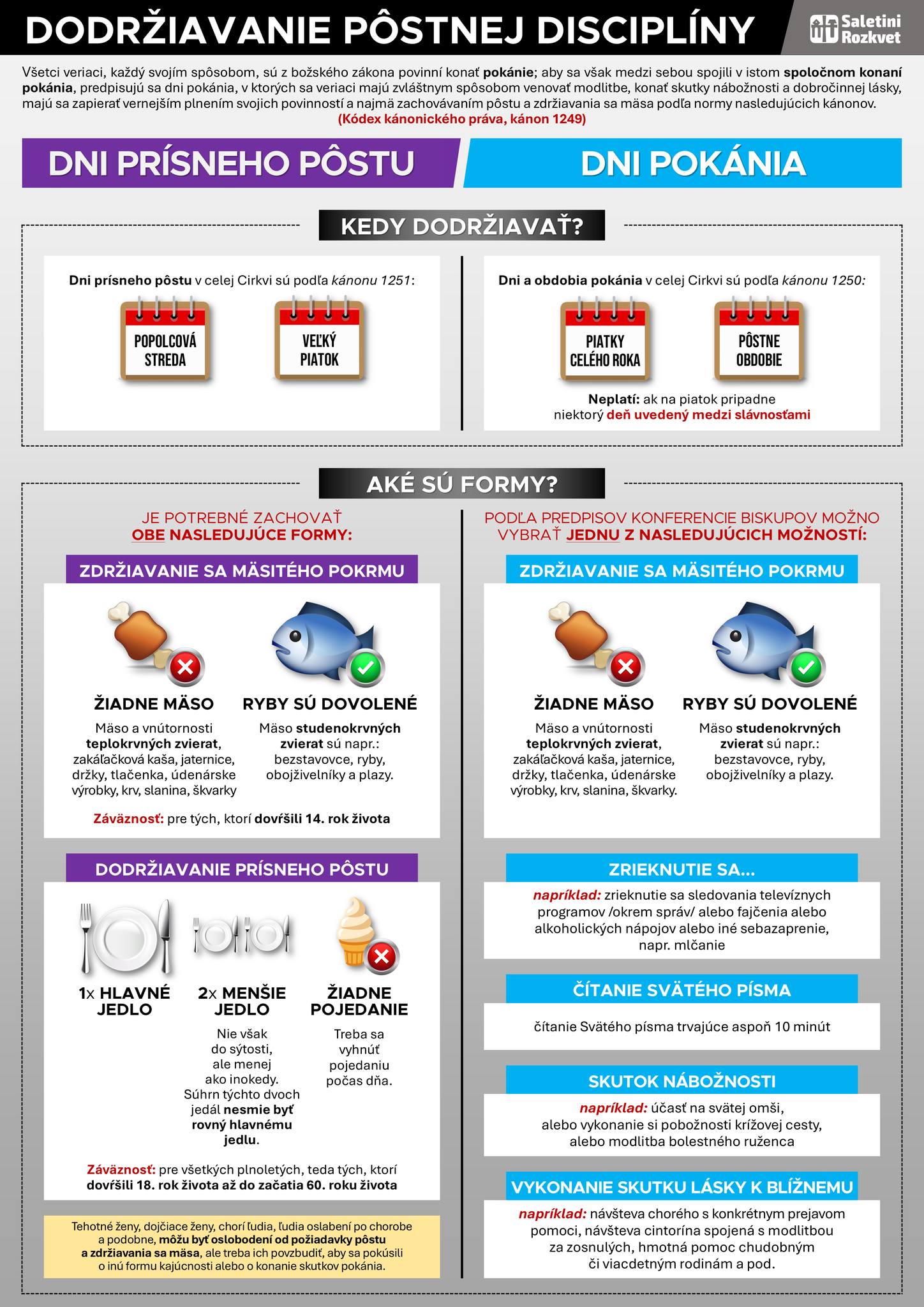 Kán. 1249: Všetci veriaci, každý svojim spôsobom, sú z božského zákona povinní konať pokánie: aby sa však všetci medzi sebou spojili v istom spoločnom konaní pokánia, predpisujú sa dni pokánia, v ktorých sa veriaci majú zvláštnym spôsobom venovať modlitbe konať skutky nábožnosti a dobročinnej lásky, majú sa zapierať vernejším plnením svojich povinností a najmä zachovávaním pôstu a zdržiavania sa mäsa poľa normy nasledujúcich kánonov.